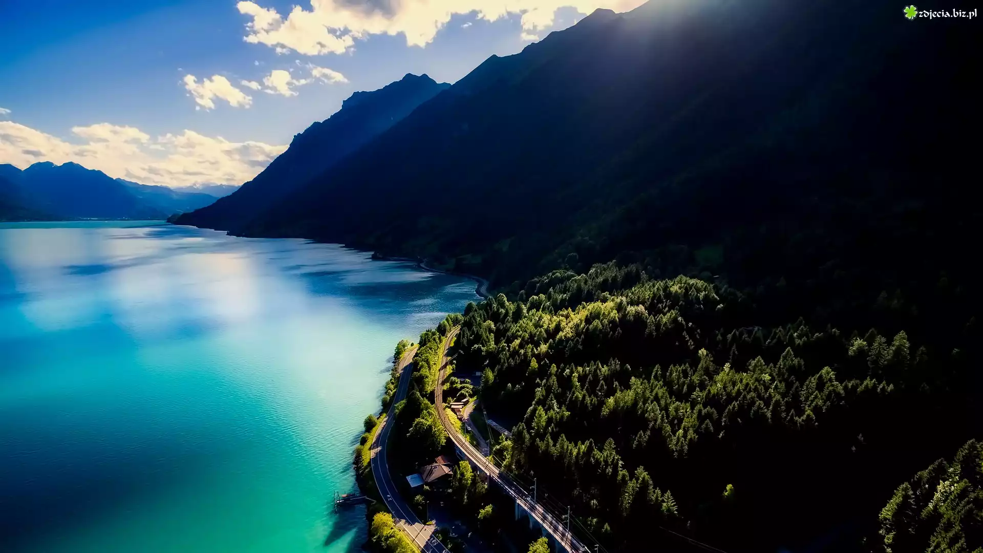 Zdjęcie Jezioro, Góry, Niebo, Chmury, Las, Droga