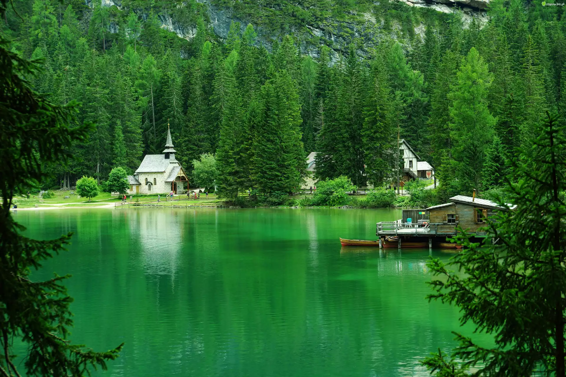 Zdjęcie Jezioro, Kościółek, Góry, Lasy, Włochy