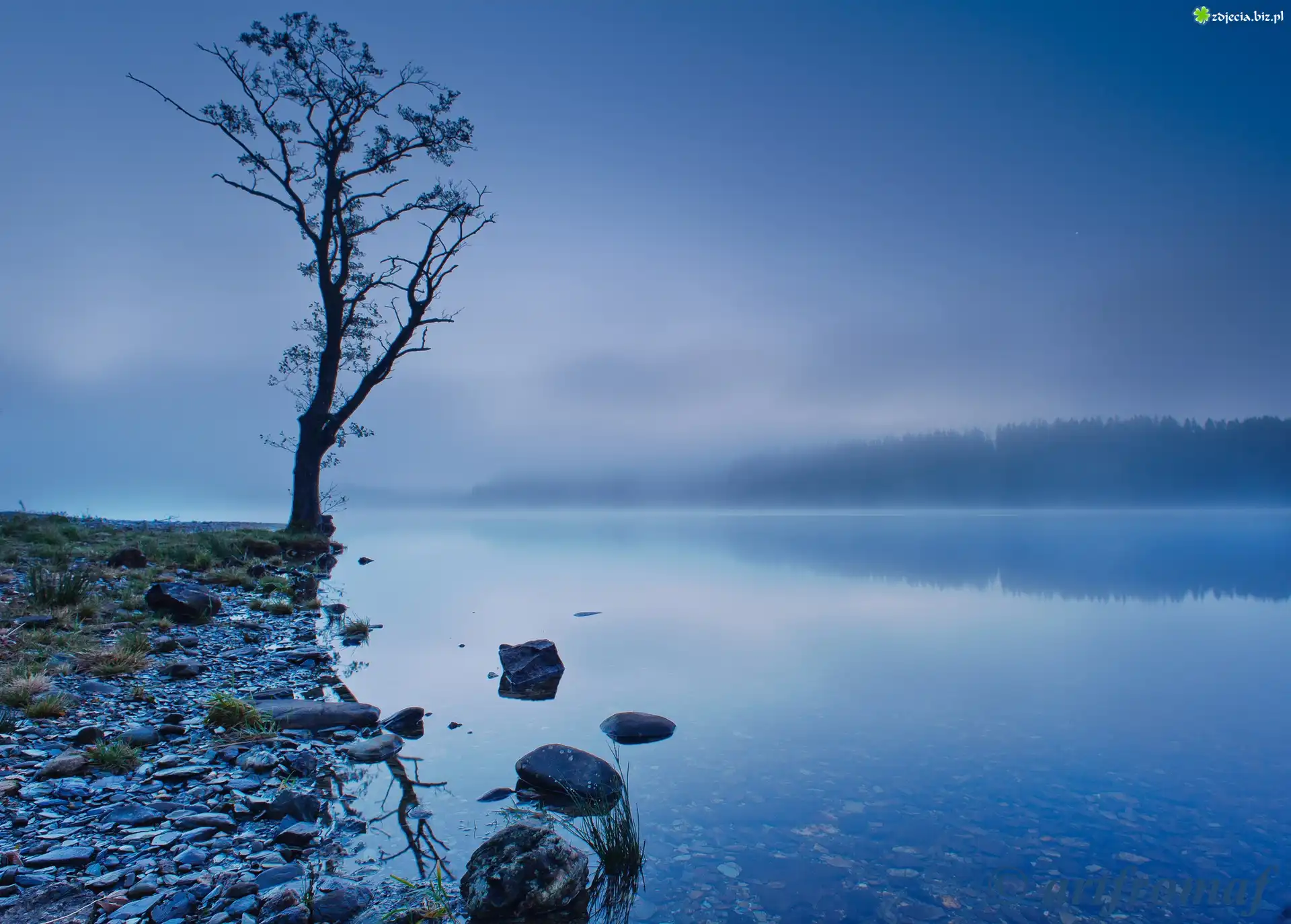 Zdjęcie Jezioro, Drzewo, Mgła, Kamienie