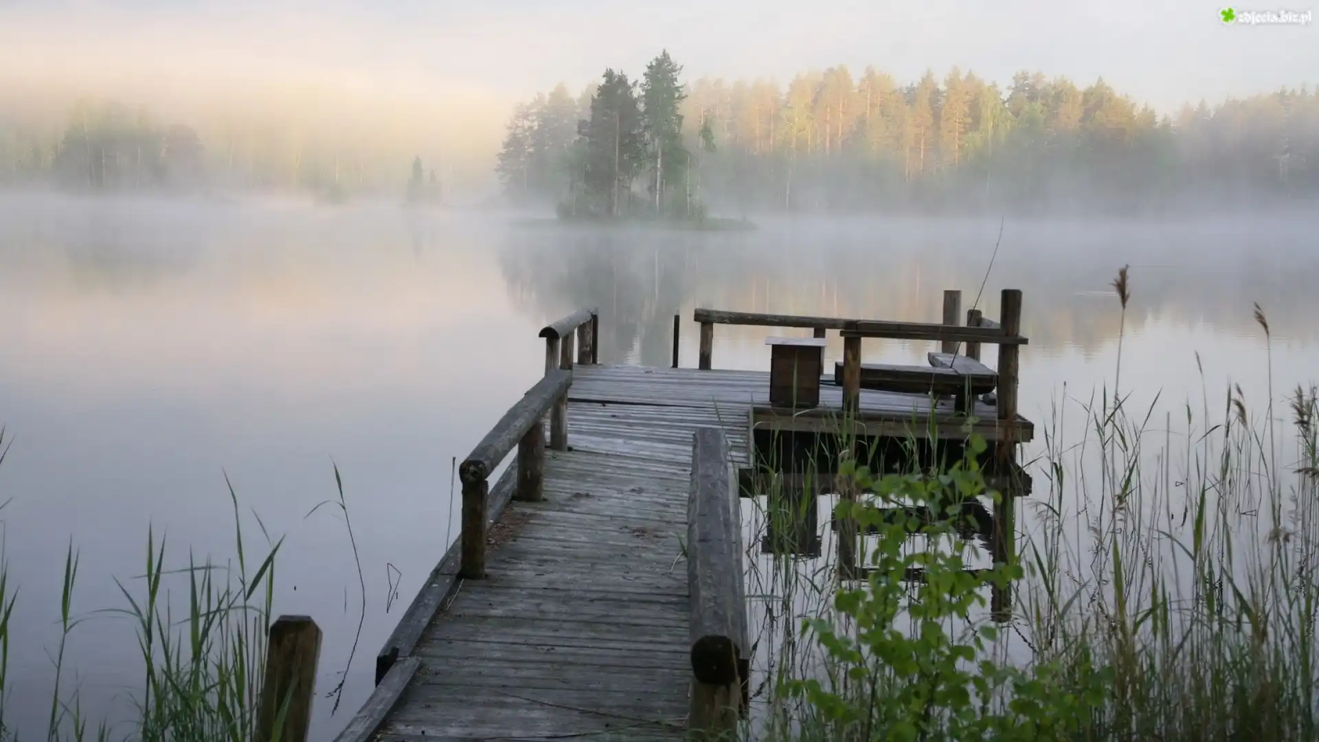 Zdjęcie Jezioro, Mgła, Drewniane, Molo, Trawy