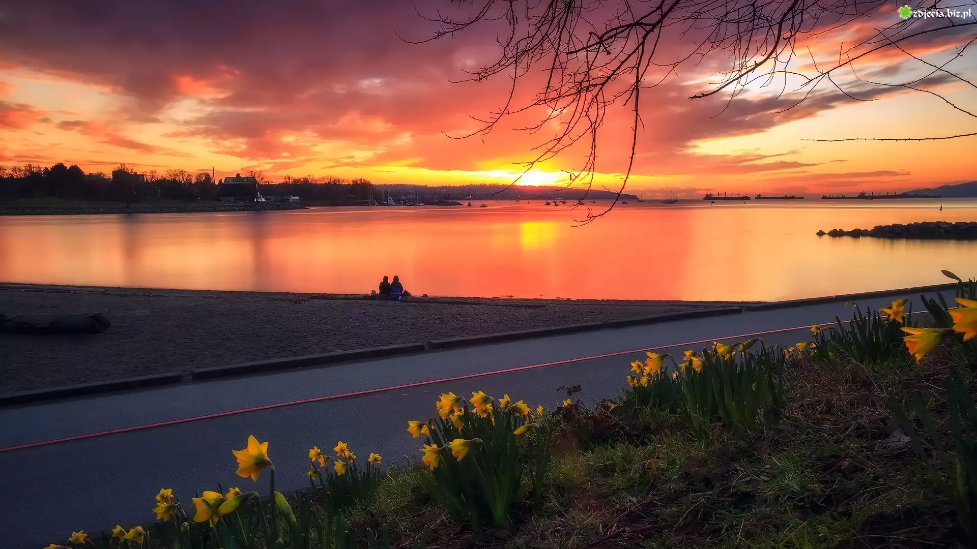 Zdjęcie Jezioro, Zachód słońca, Droga, Narcyzy żonkile