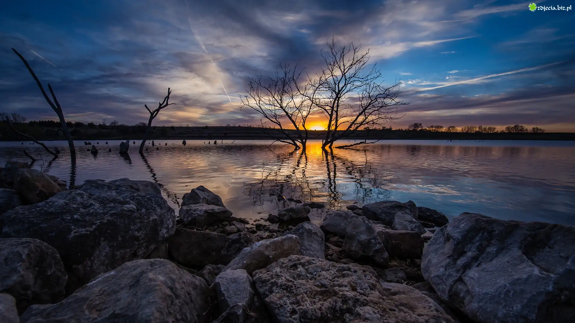 Zdjęcie Jezioro, Kamienie, Zachód słońca, Niebo, Drzewa
