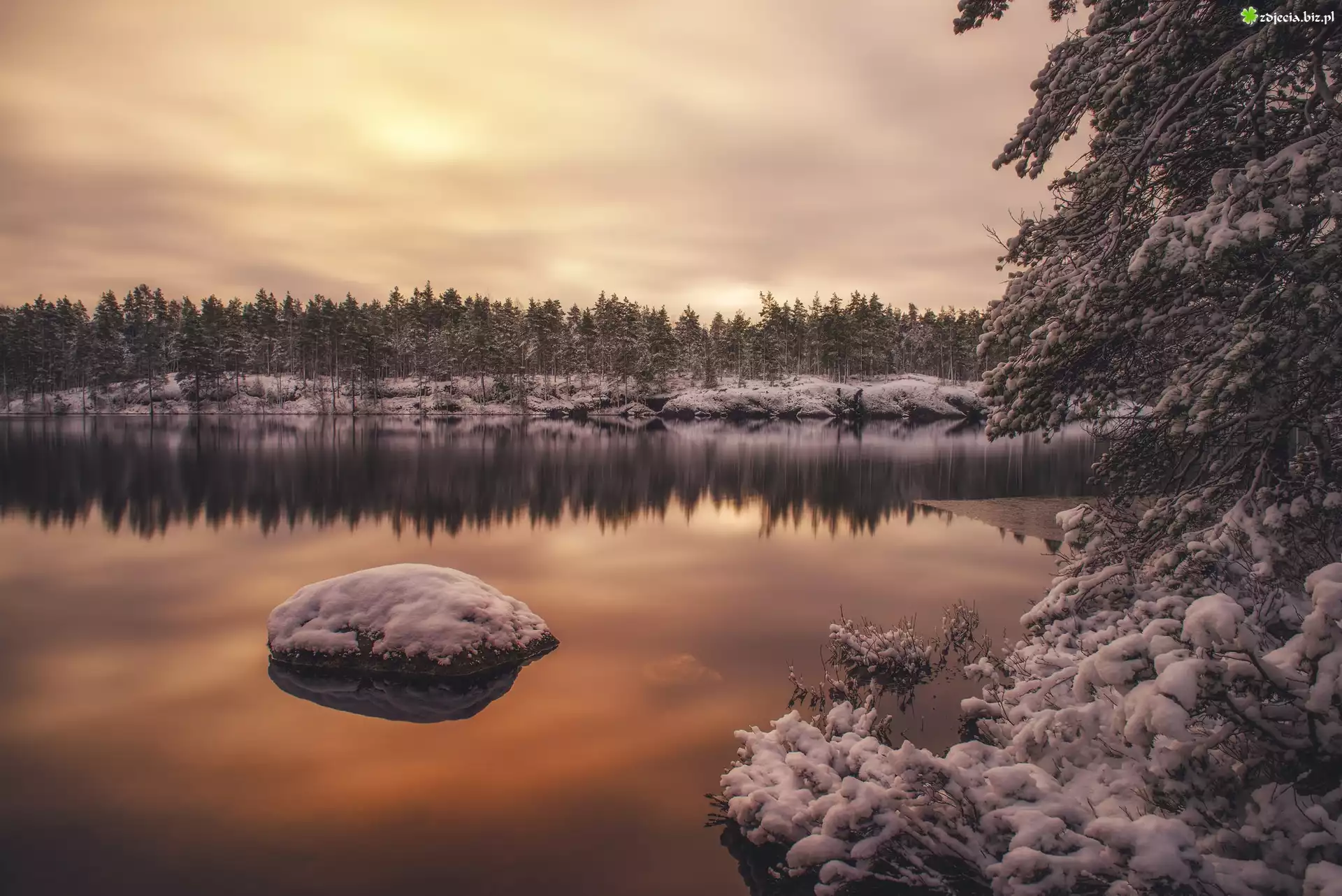 Zdjęcie, Zima, Jezioro, Kamień, Las, Ośnieżone, Drzewa, Zmierzch, Odbicie