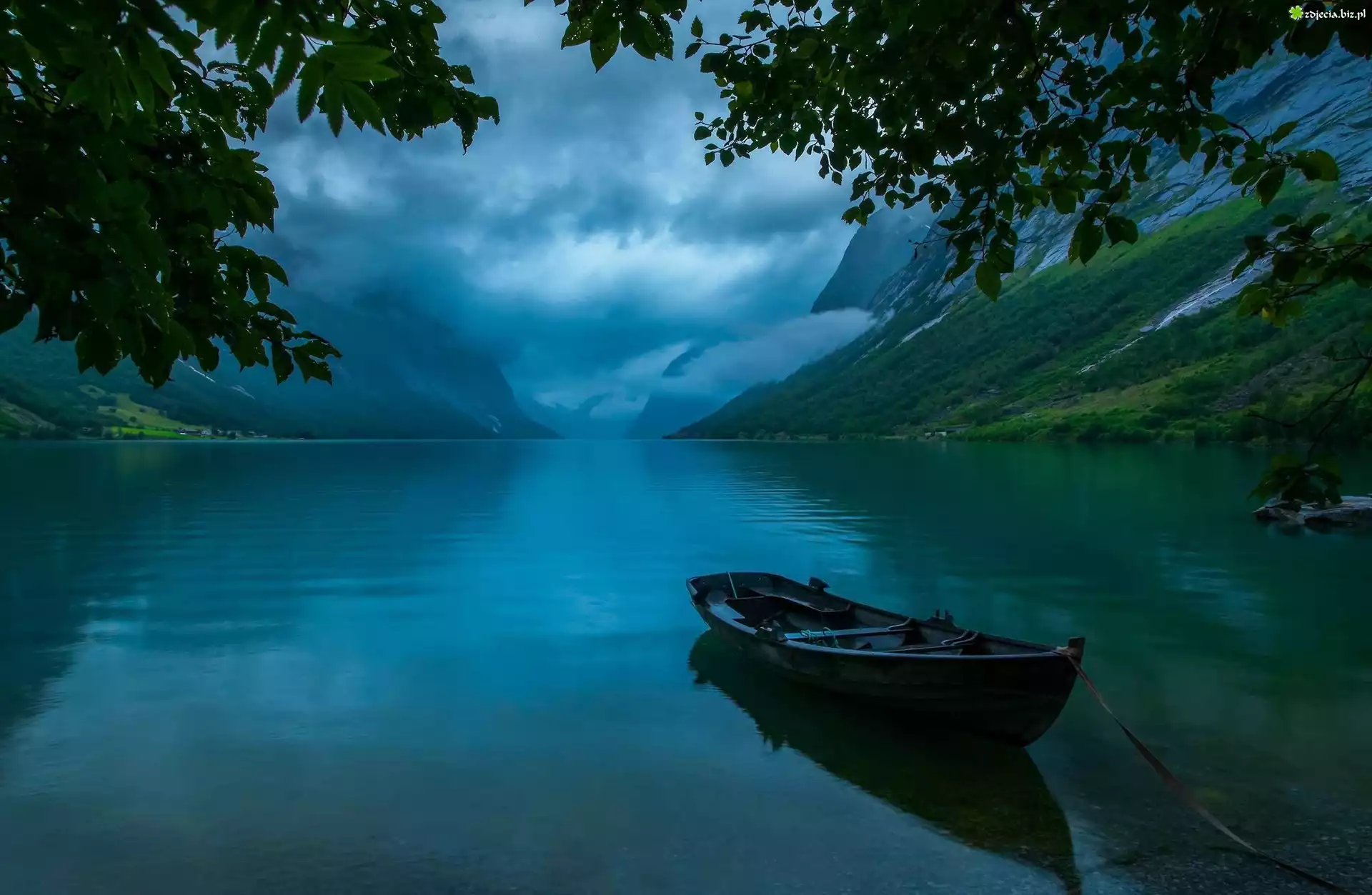 Zdjęcie Norwegia, Jezioro Jølstravatn, Wieczór, Góry, Łódź