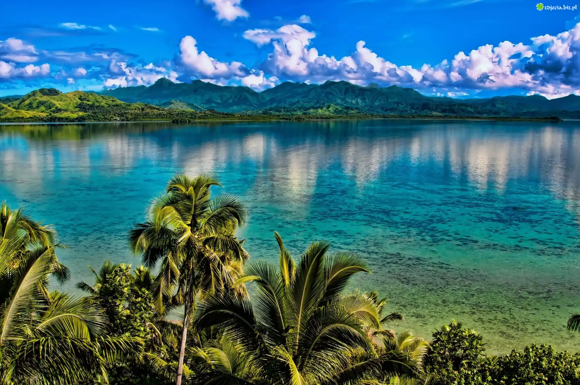 Zdjęcie, Jezioro, Góry, Palmy, Chmury