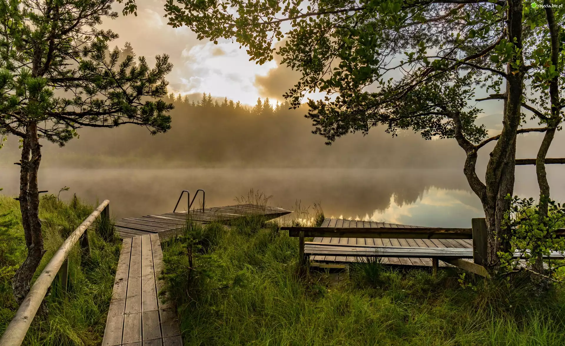 Zdjęcie Jezioro, Mgła, Pomost, Drzewa