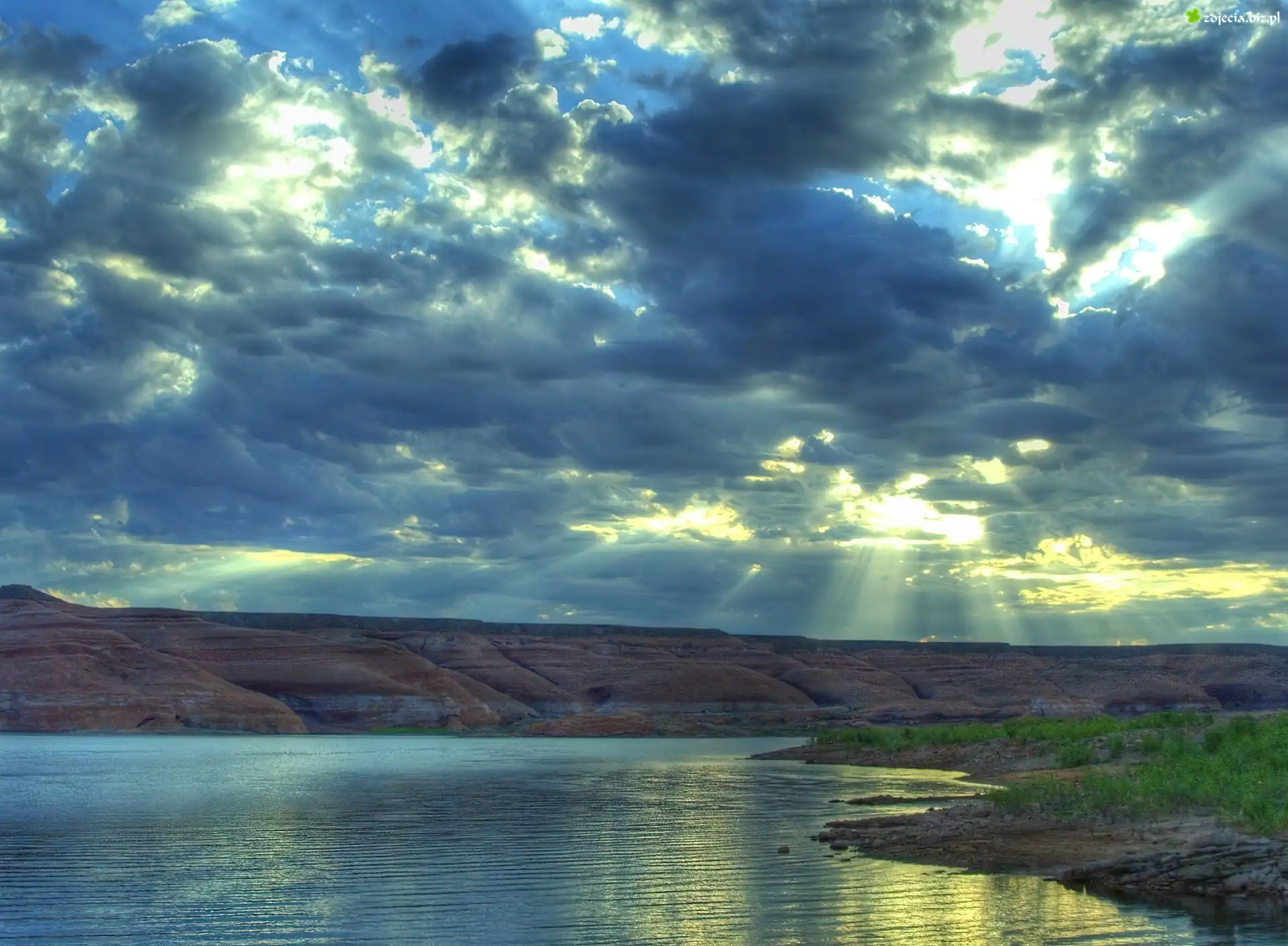 Zdjęcie Jezioro, Góry, Chmury, Promienie Słońca