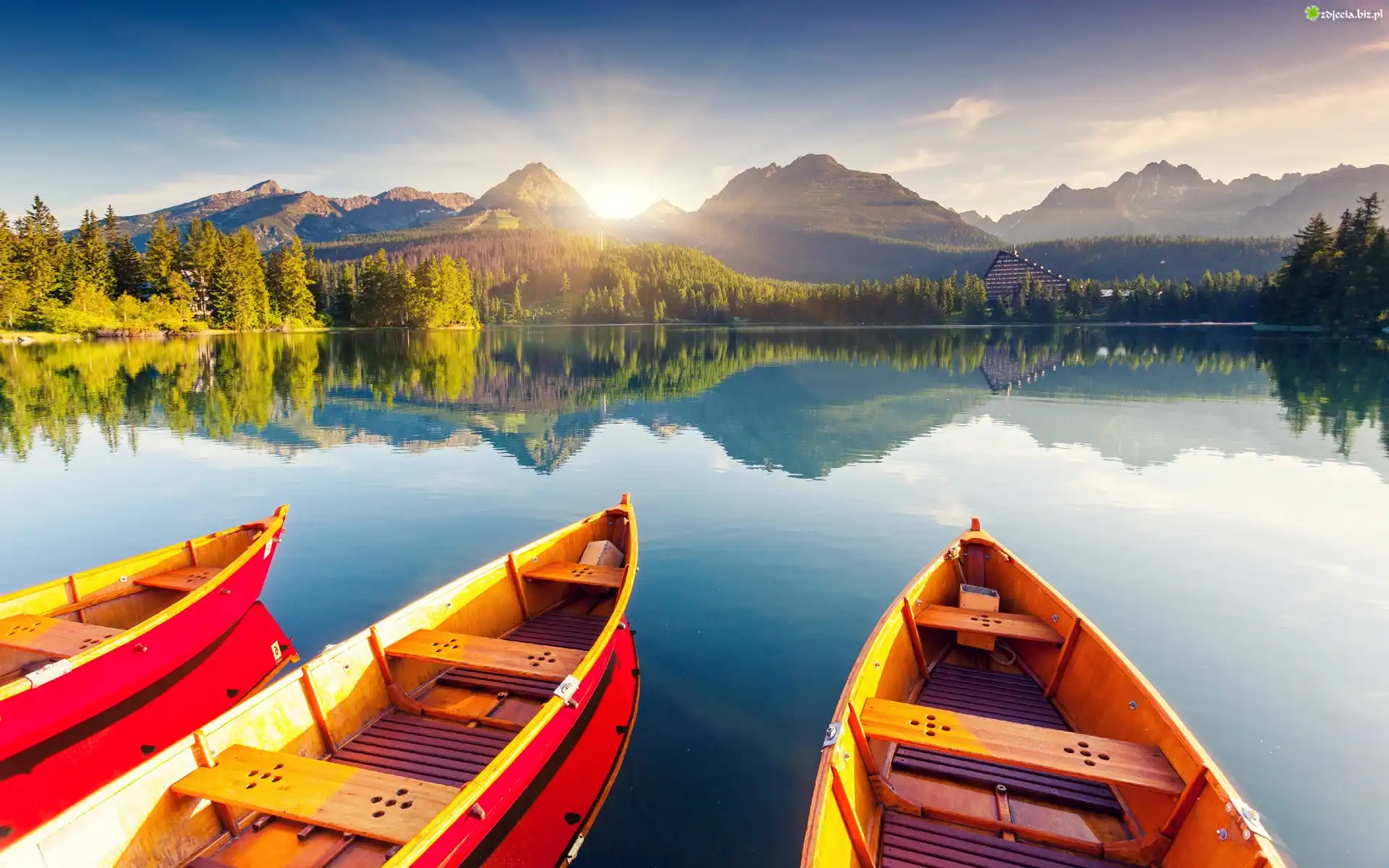 Zdjęcie Jezioro, Łódki, Góry, Lasy, Promienie, Słońca