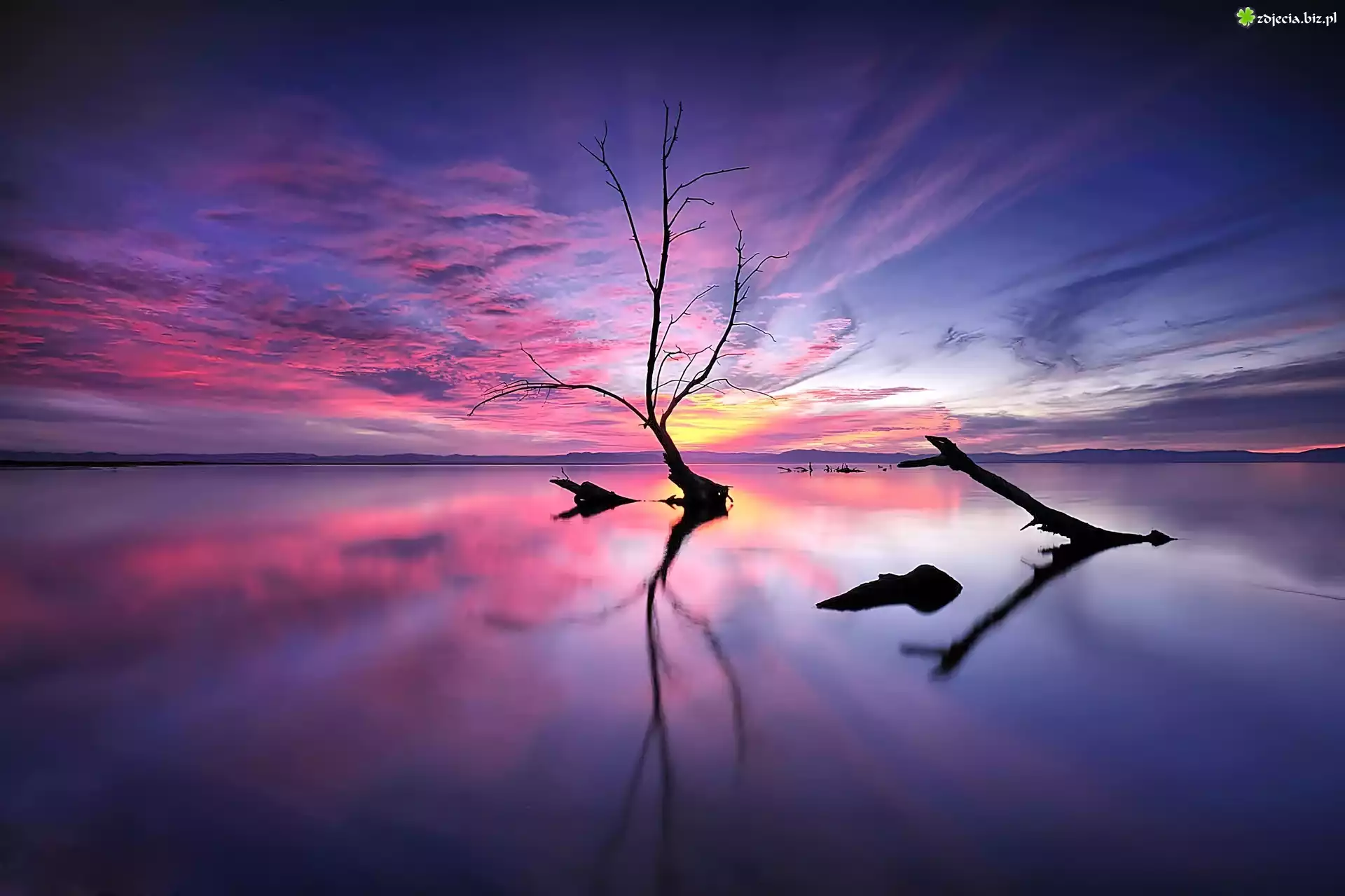 Zdjęcie Jezioro, Obumarłe, Drzewa, Chmury, Przebijające, Światło