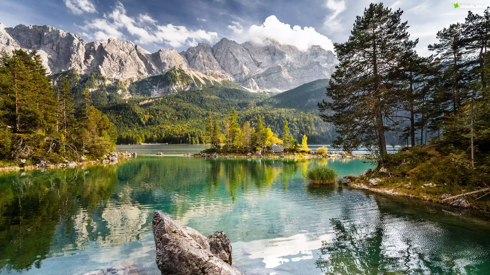Zdjęcie, Drzewa, Góry, Skała, Jezioro Elbsee, Bawaria, Niemcy