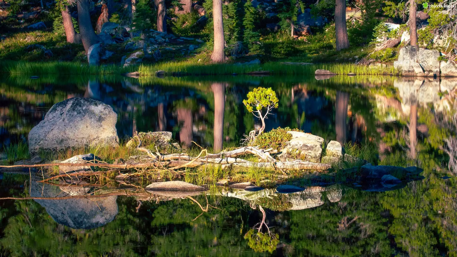 Zdjęcie Drzewa, Jezioro, Skały, Odbicie, Rośliny