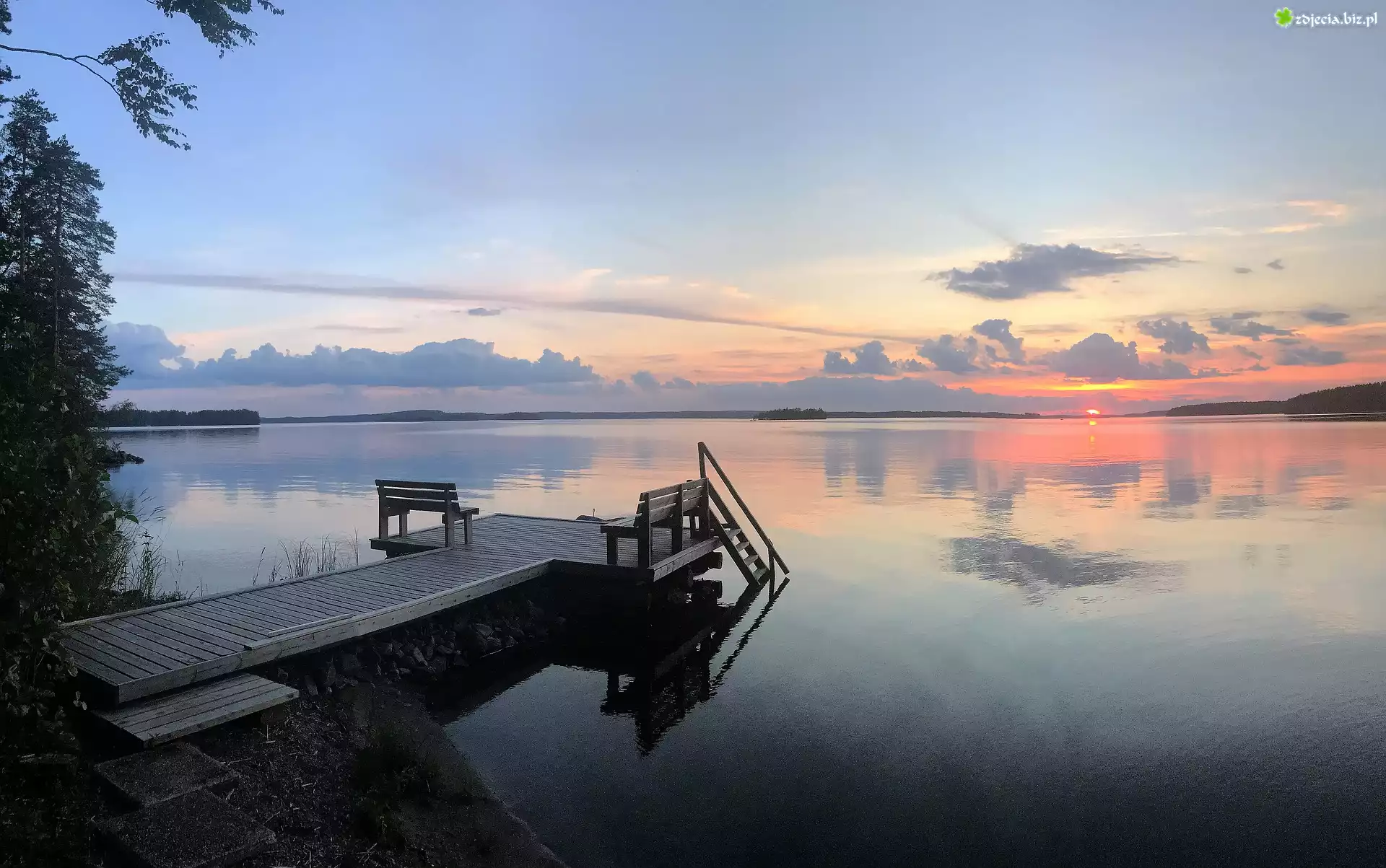 Zdjęcie Jezioro, Pomost, Ławka, Zachód słońca, Chmury
