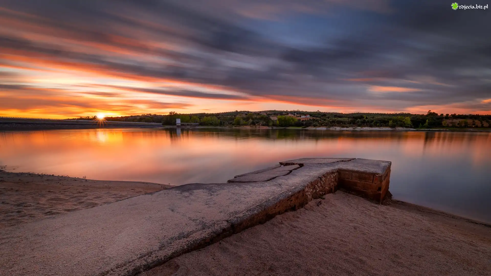 Zdjęcie Jezioro, Drzewa, Domy, Zachód słońca, Chmury