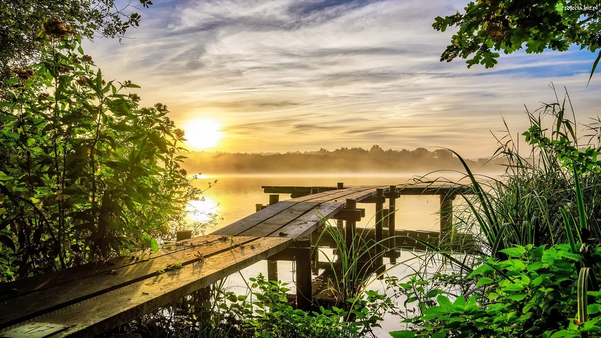 Zdjęcie Jezioro, Pomost, Mgła, Wschód słońca, Roślinność