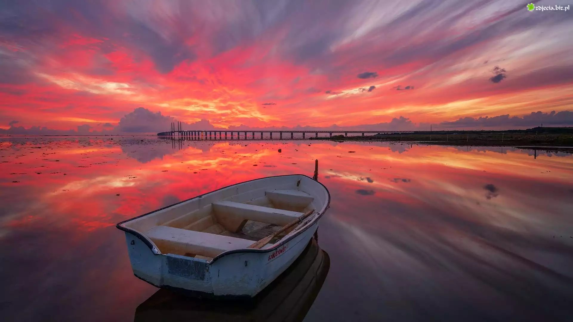 Zdjęcie Jezioro, Most, Łódka, Zachód słońca, Chmury