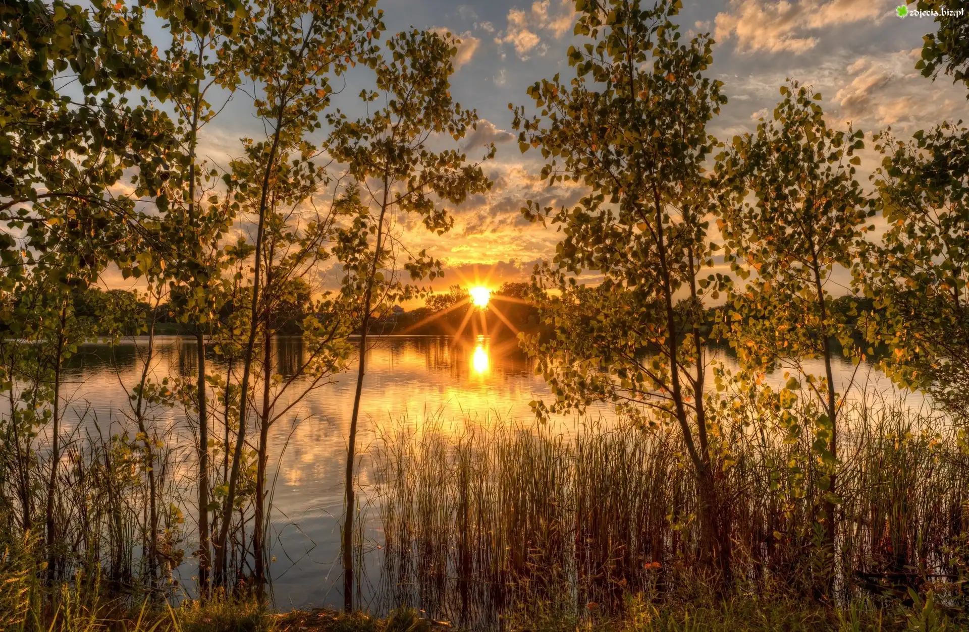 Zdjęcie Jezioro, Drzewa, Roślinność, Wschód słońca, Promienie