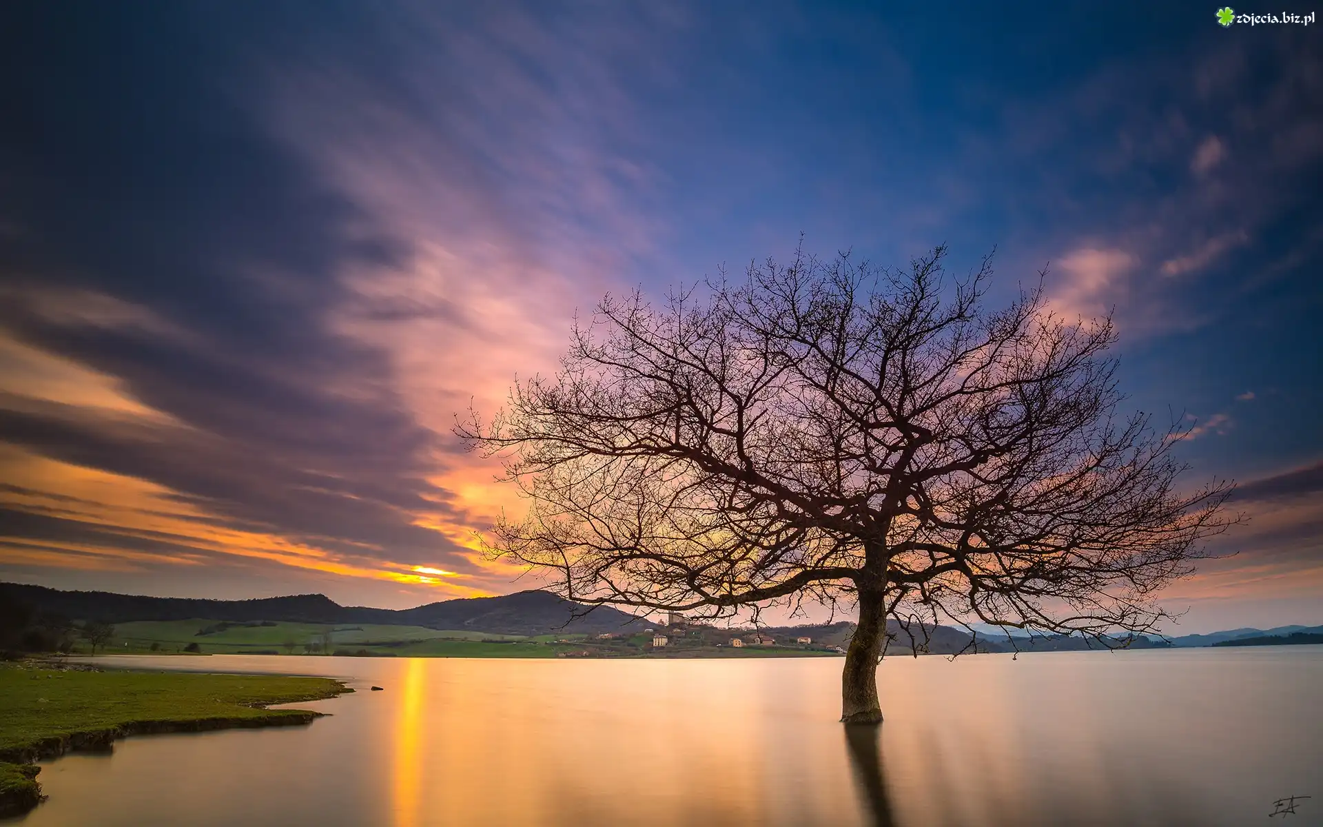 Zdjęcie, Jezioro, Góry, Zachód słońca, Drzewo