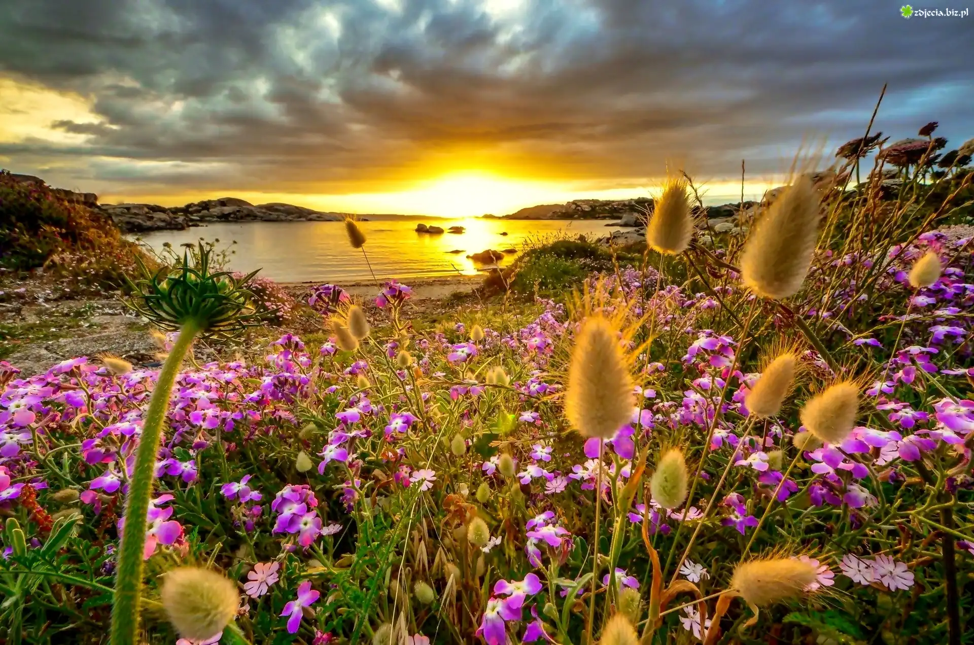 Zdjęcie, Jezioro, Zachód, Słońca, Kwiaty