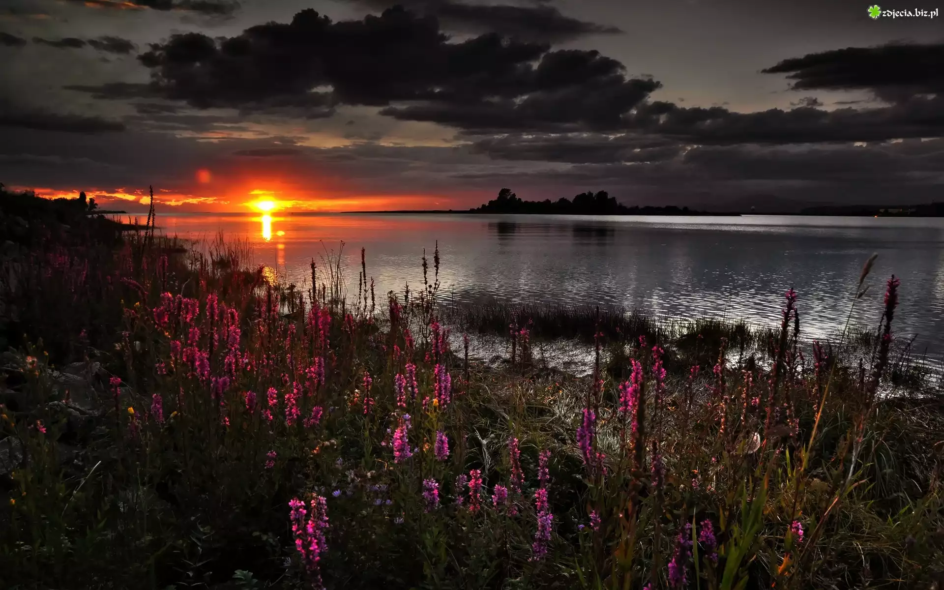 Zdjęcie Jezioro, Zachód, Słońca, Kwiaty