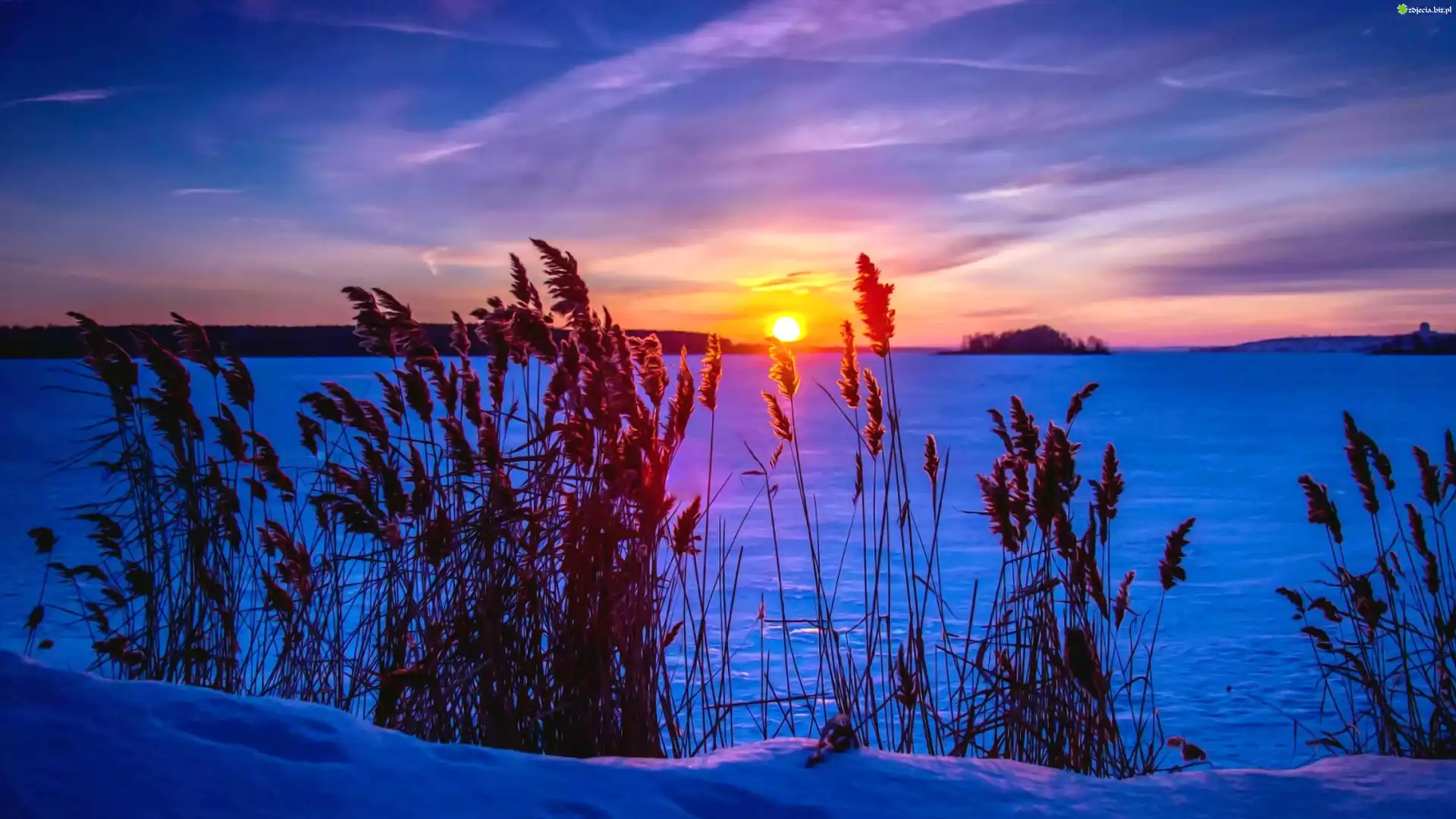 Zdjęcie Jezioro, Trawy, Zachód, Słońca, Zima