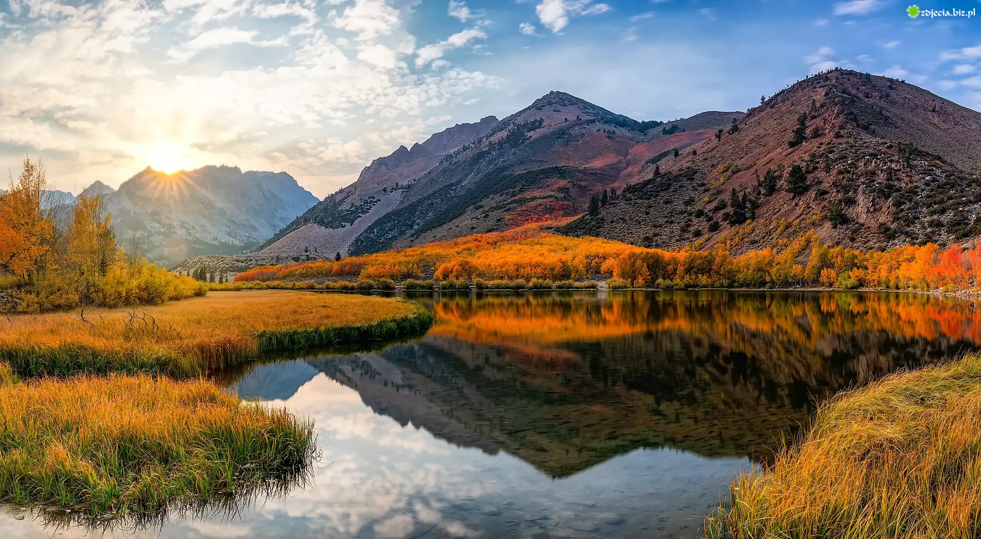 Zdjęcie Jezioro, North Lake, Góry, Sierra Nevada, Trawy, Pożółkłe, Drzewa, Jesień, Obłoki, Promienie słońca, Kalifornia, Stany Zjednoczone |