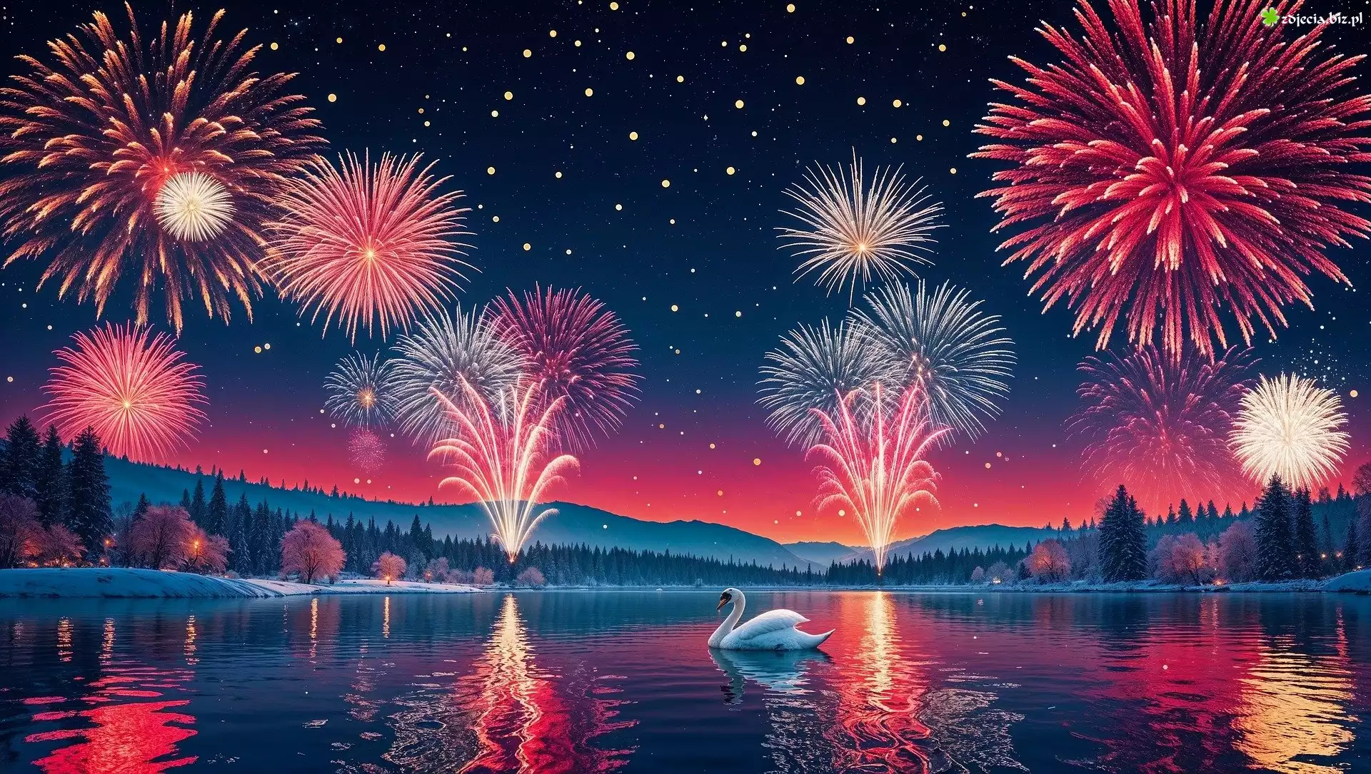 Zdjęcie Sylwester, Fajerwerki, Łabędź, Jezioro
