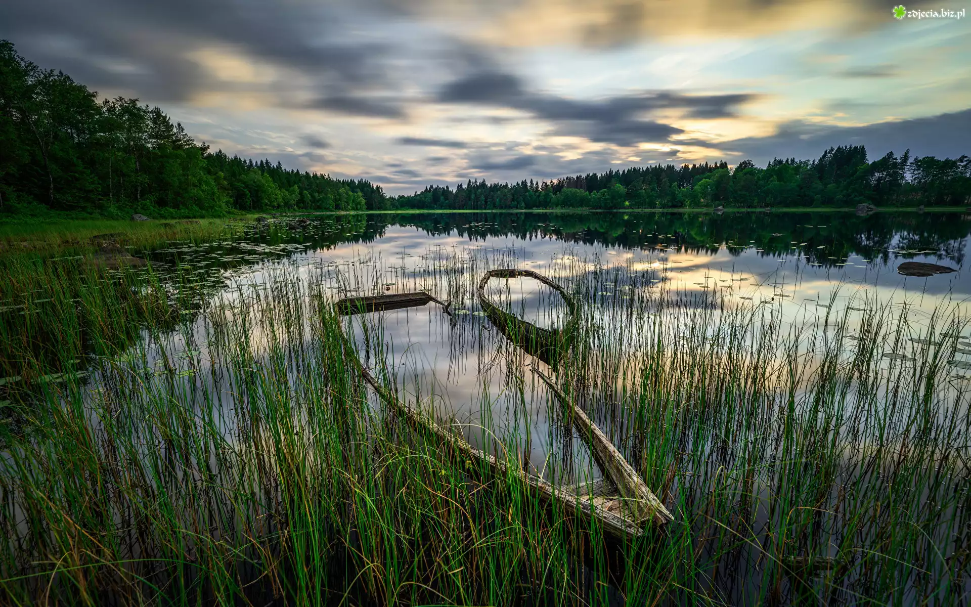 Zdjęcie Las, Jezioro, Szuwary, Zatopione, Łodzie