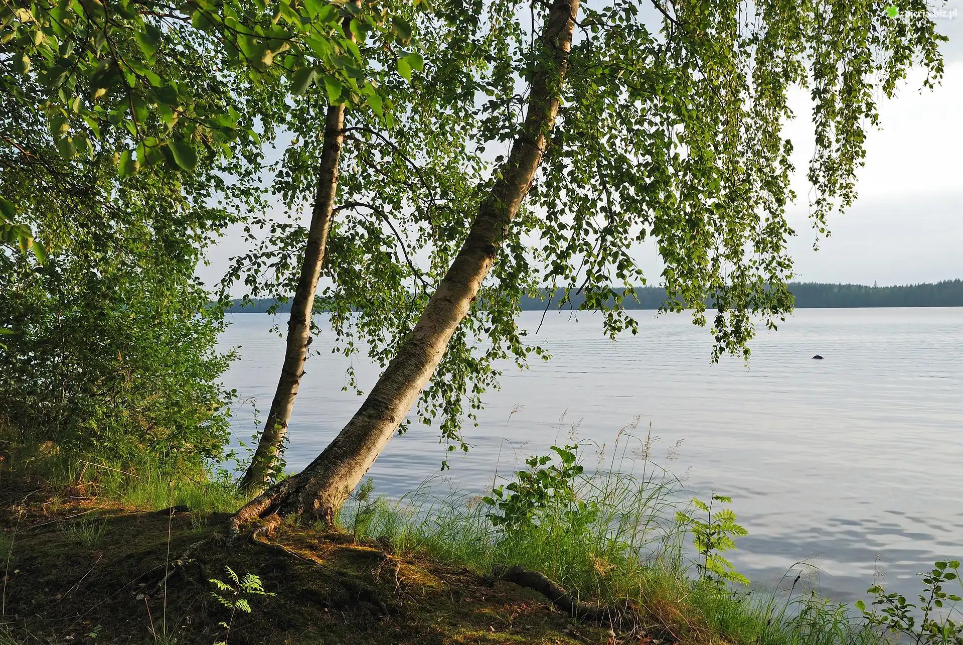 Zdjęcie Jezioro, Drzewa, Brzozy, Trawa, Brzeg