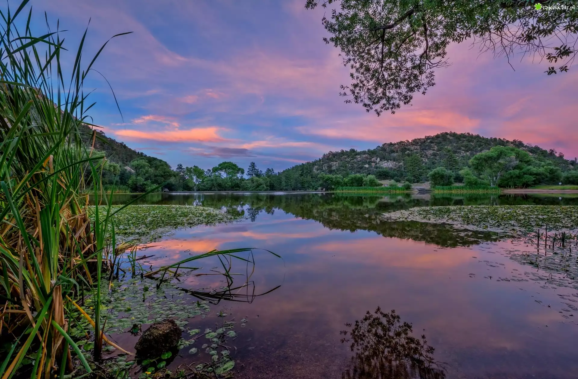 Zdjęcie Jezioro, Wzgórza, Trawy, Rośliny