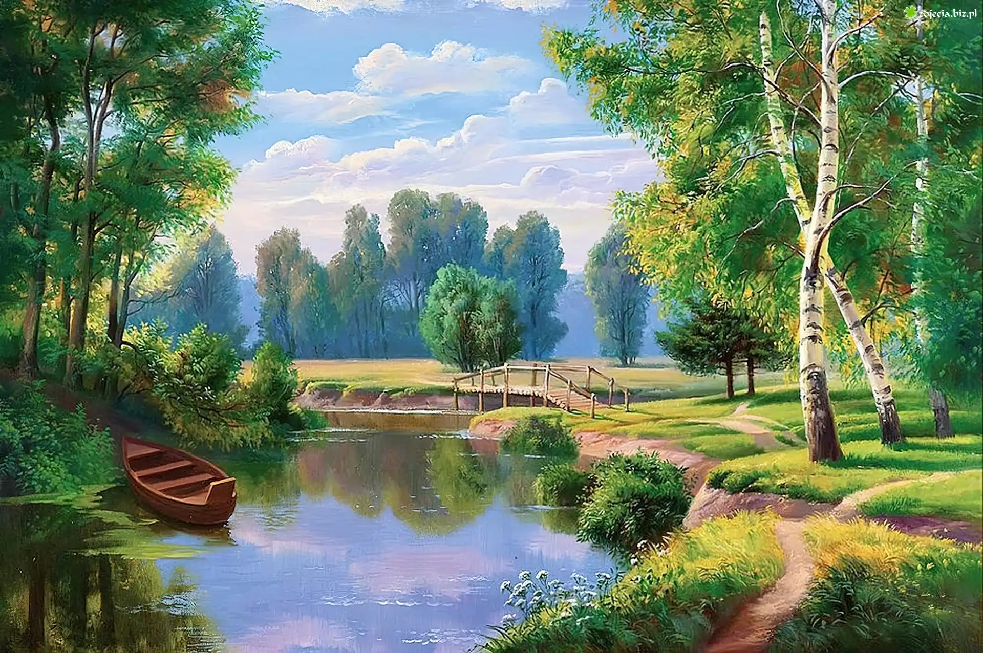 Zdjęcie Jezioro, Łódka, Drzewa, Widoczek, Malarstwo
