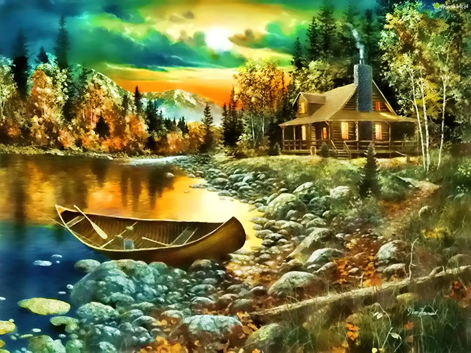 Zdjęcie Jezioro, Domek, Łódka, Widoczek, Malarstwo