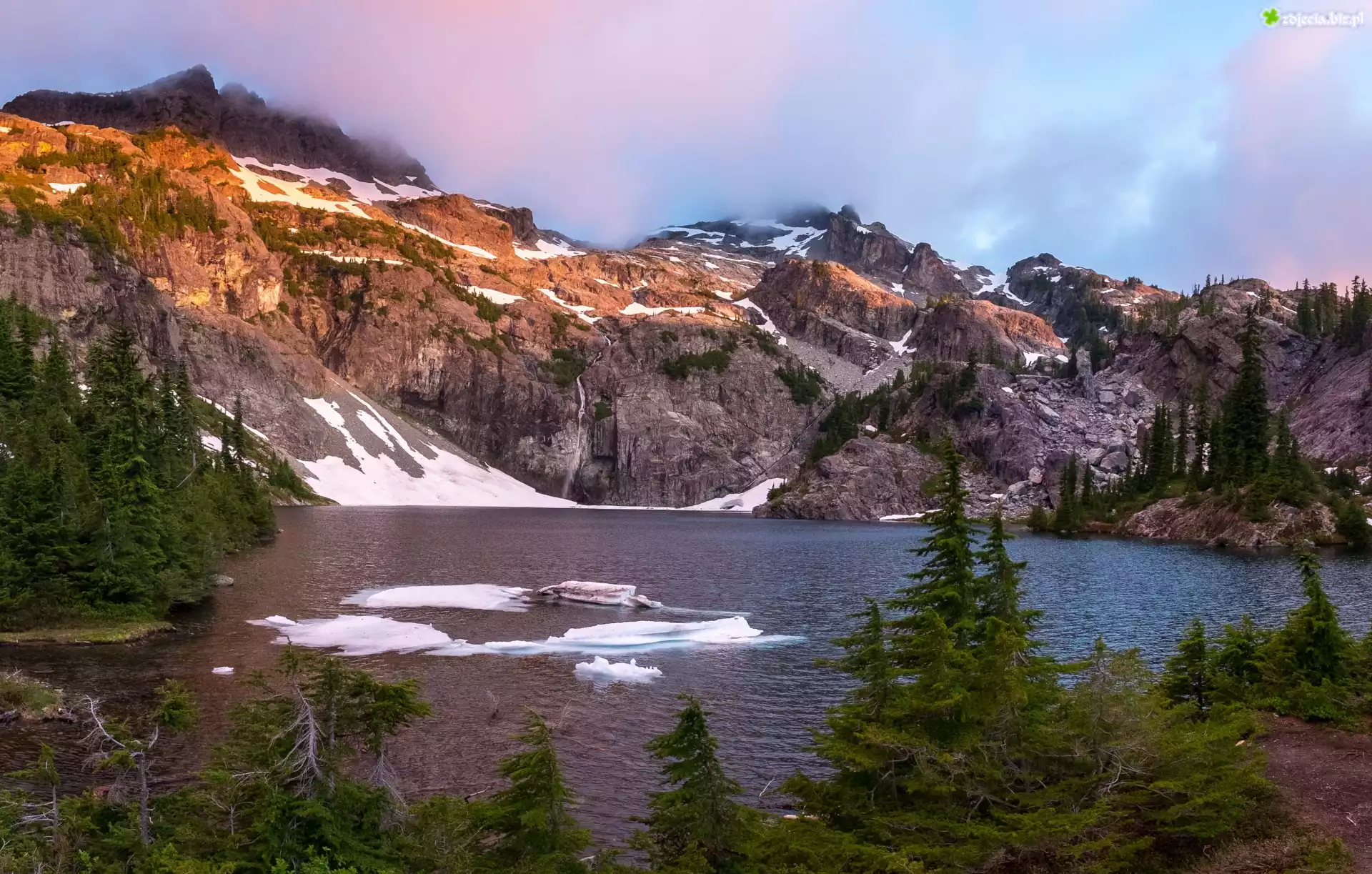 Zdjęcie Jezioro, Góry, Świerki, Śnieg