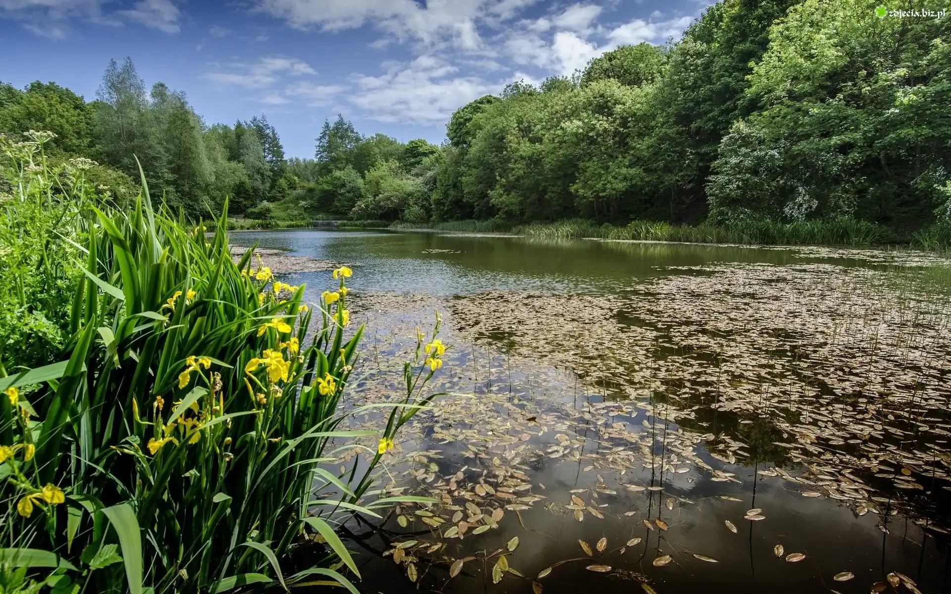 Zdjęcie Lato, Jezioro, Opadłe, Liście, Drzewa, Kwiaty, Irysy wodne