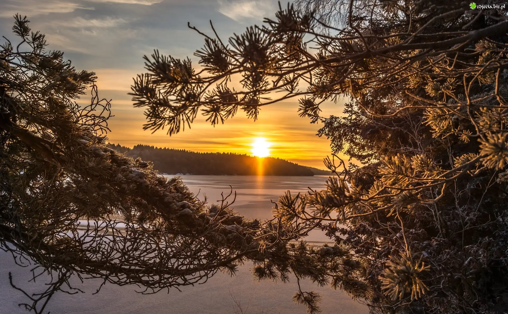 Zdjęcie Jezioro, Gałęzie, Drzewa, Wschód słońca