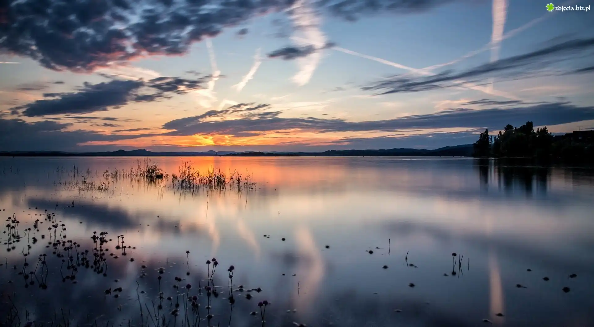 Zdjęcie Jezioro, Niebo, Drzewa, Rośliny, Wschód, Słońca