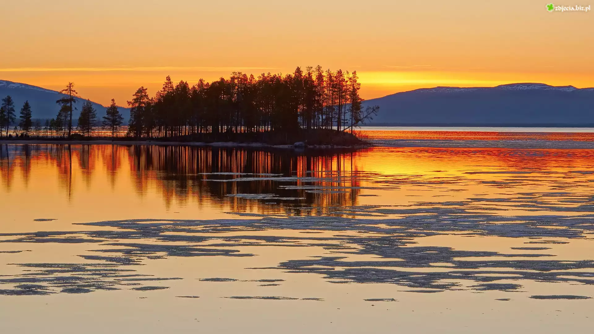Zdjęcie Jezioro, Góry, Wysepka, Drzewa, Wschód, Słońca