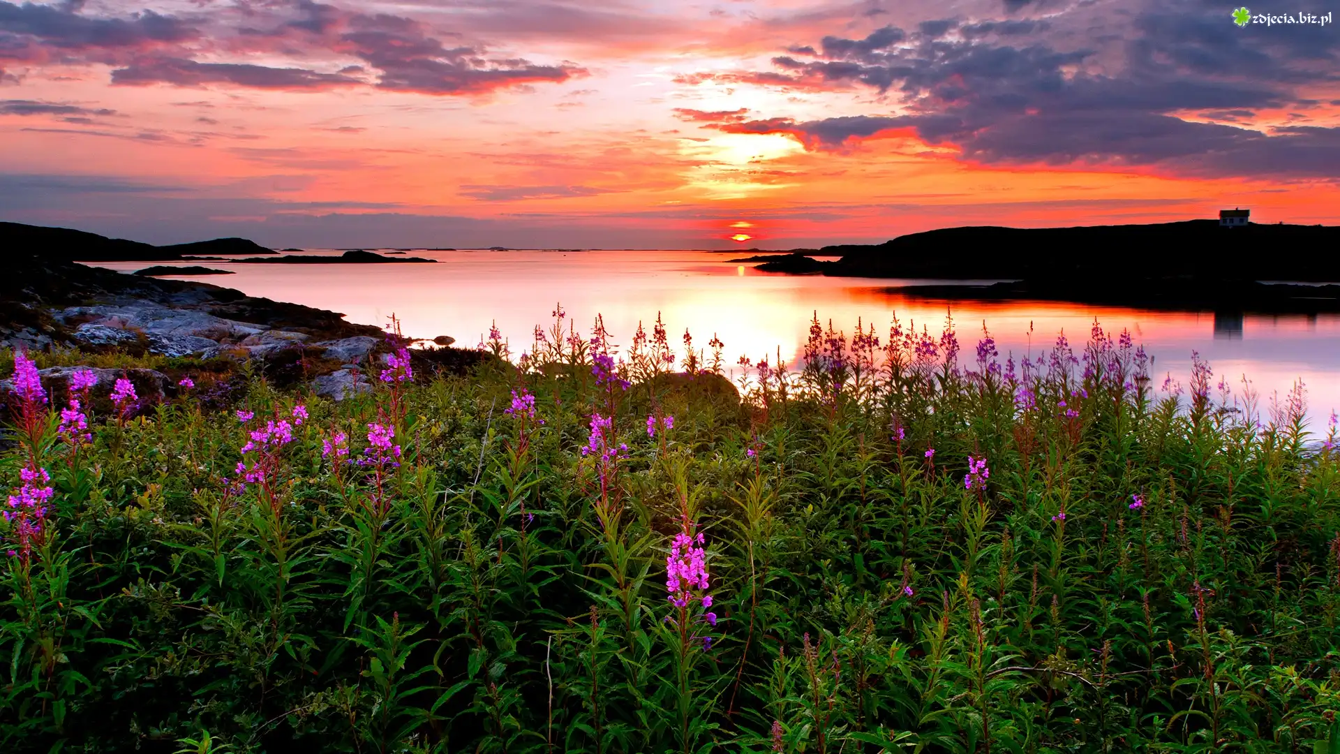 Zdjęcie Jezioro, Zachód, Słońca, Wybrzeże, Kwiaty