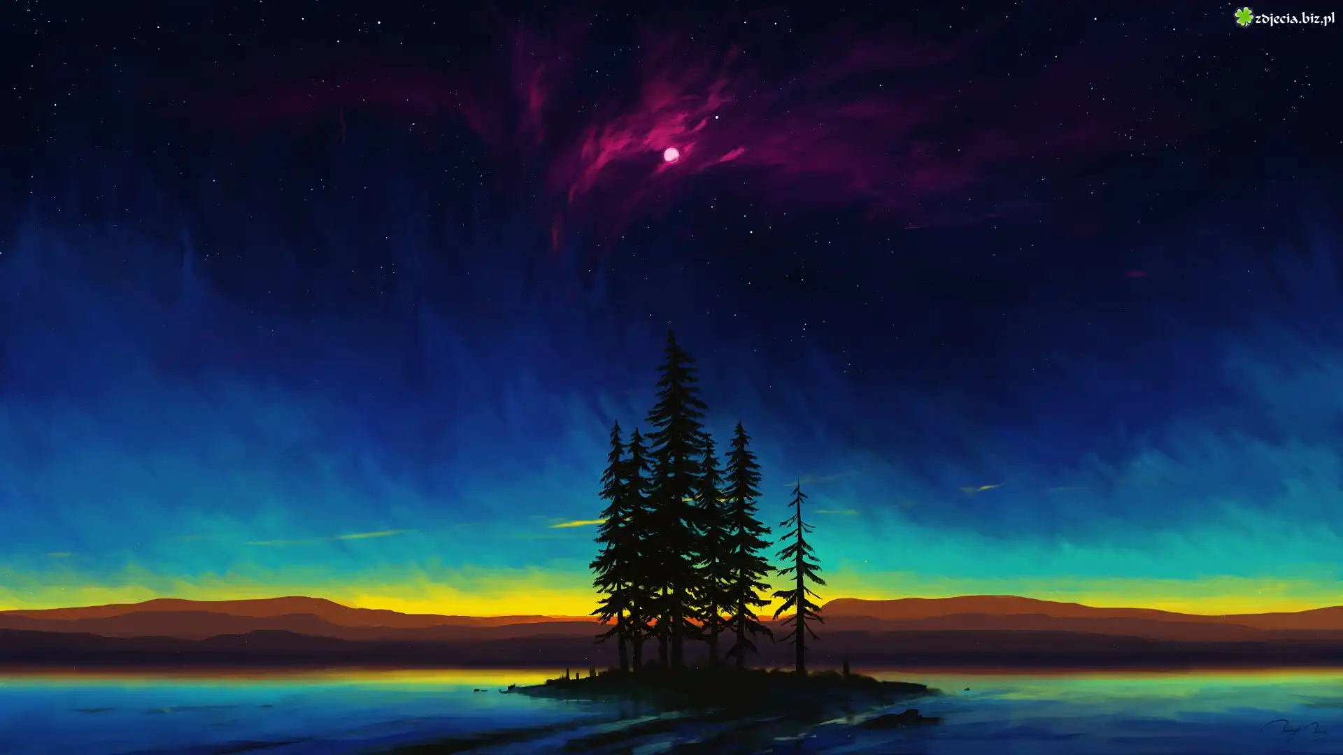 Zdjęcie Wyspa, Jezioro, Drzewa, Niebo, Gwiazdy, Księżyc, Grafika