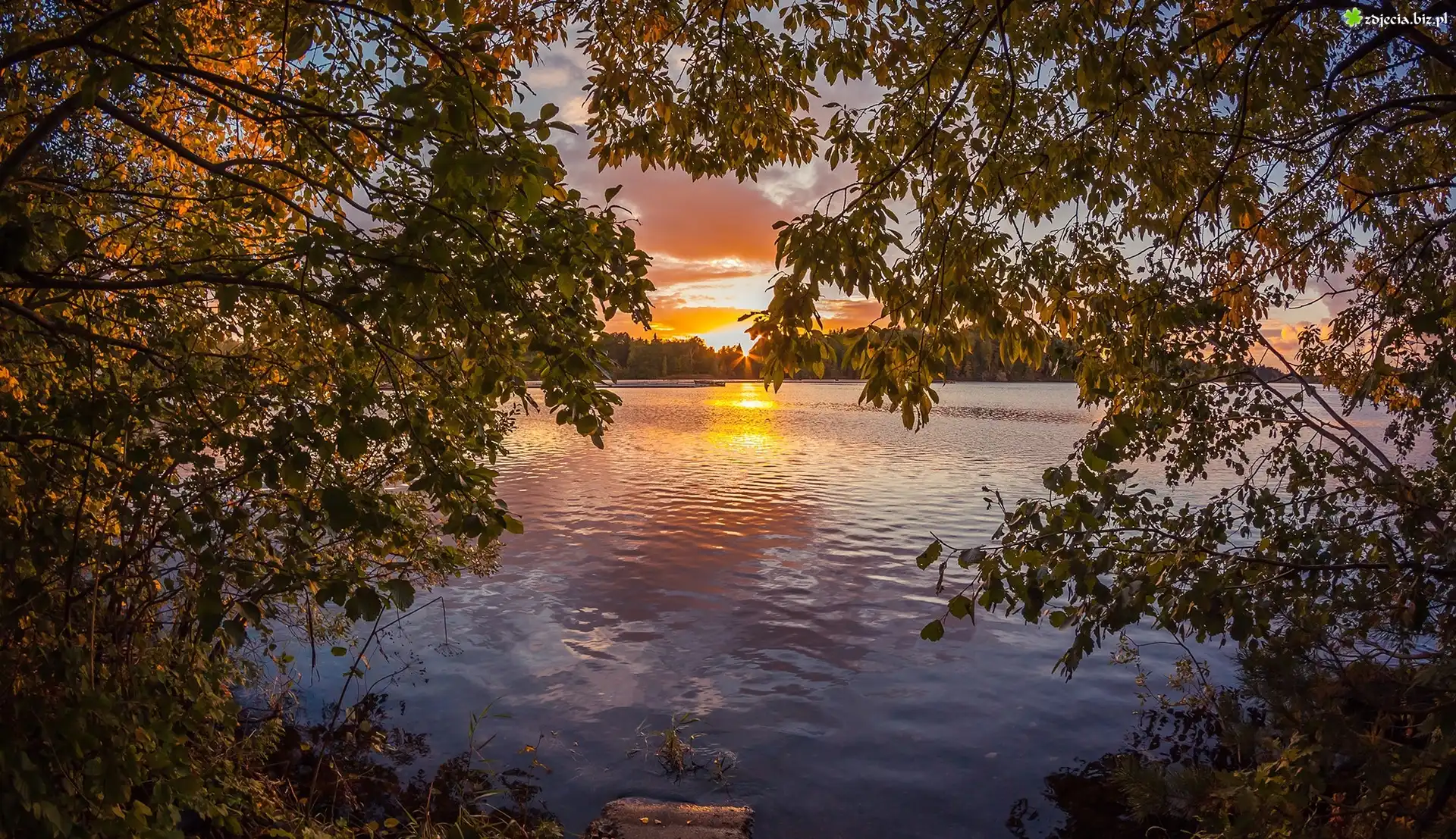 Zdjęcie Jezioro, Drzewa, Gałęzie, Liście, Zachód słońca