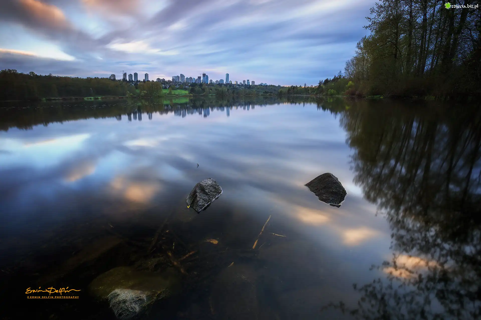 Zdjęcie, Zachód słońca, Zarośla, Kamienie, Odbicie, Jezioro Deer, Deer Lake Park, Burnaby, Kanada