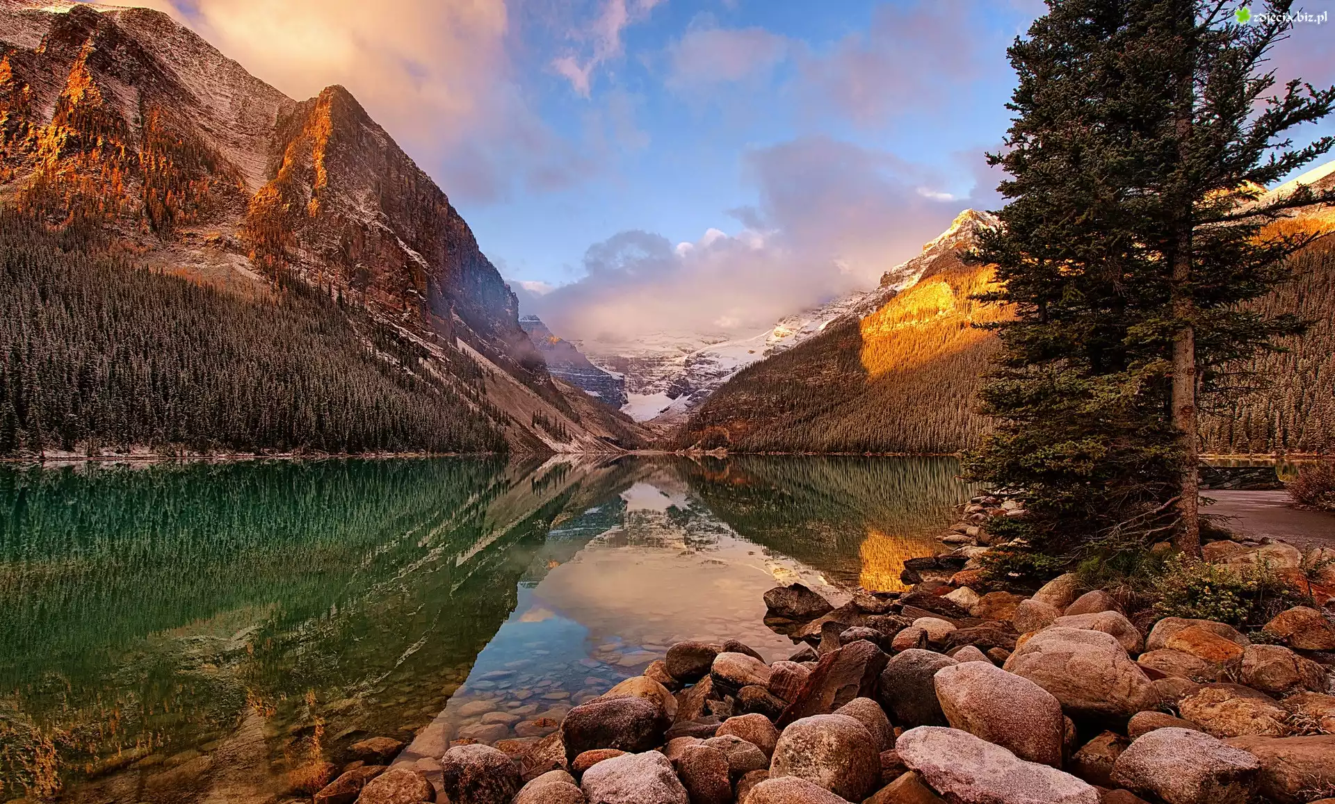 Zdjęcie, Jezioro, Góry, Lasy, Zachód Słońca