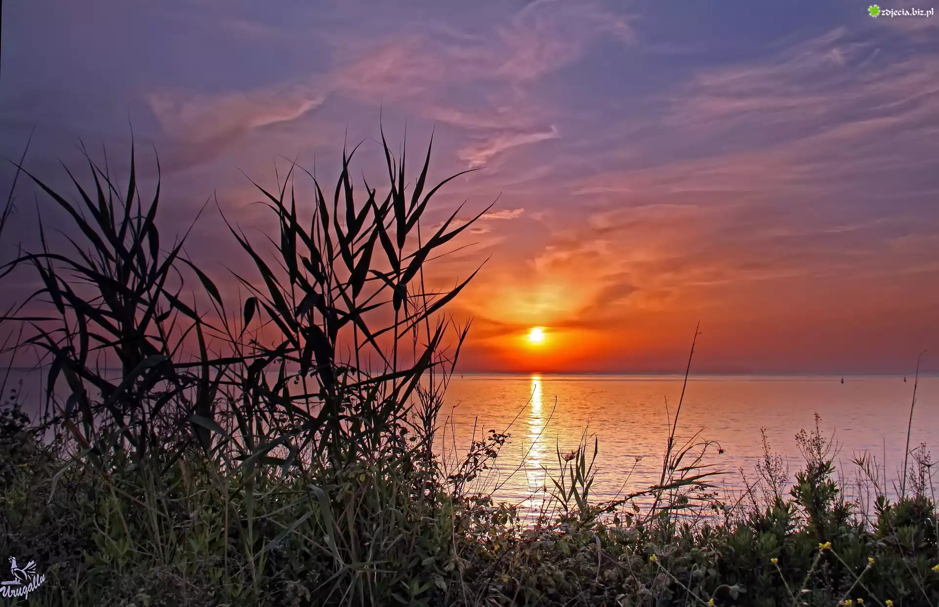 Zdjęcie Jezioro, Żaglówki, Trawy, Zachód, Słońca