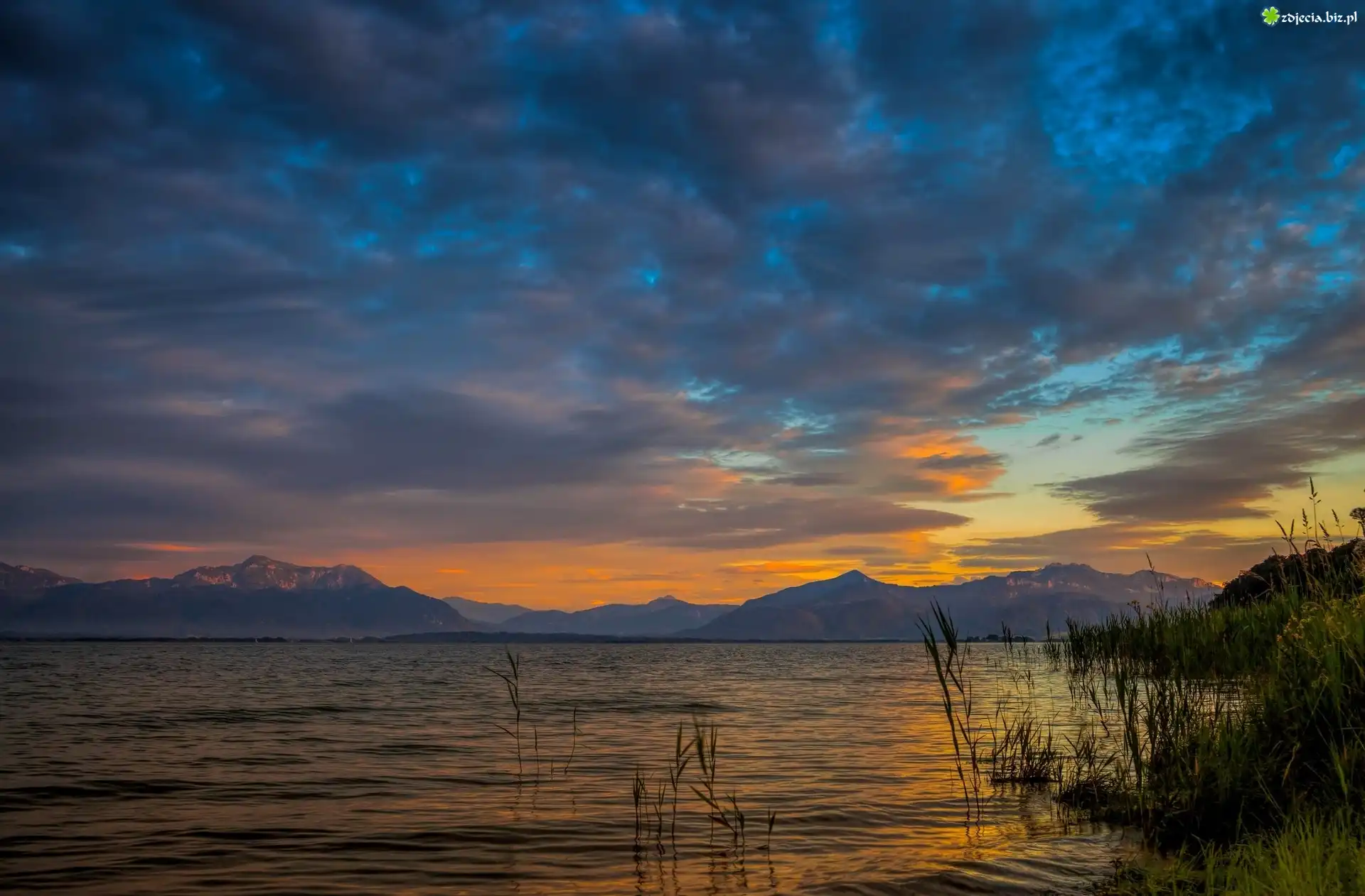 Zdjęcie, Jezioro, Góry, Trawy, Zachód, Słońca