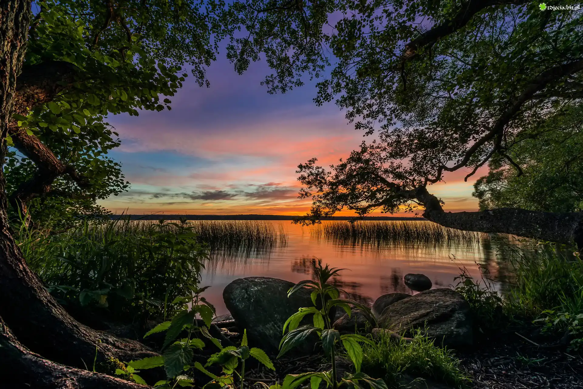 Zdjęcie Jezioro, Kamienie, Trzciny, Drzewa, Zachód, Słońca