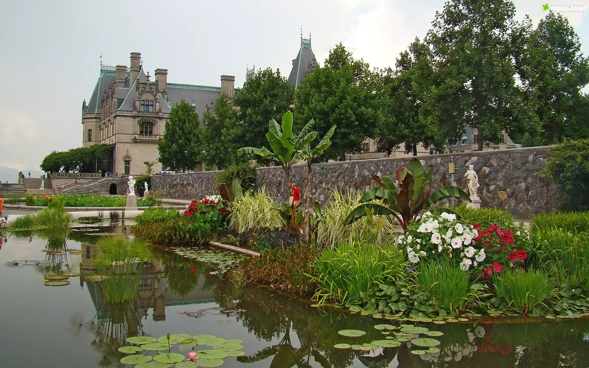 Zdjęcie, Zamek, Jezioro, Kwiaty