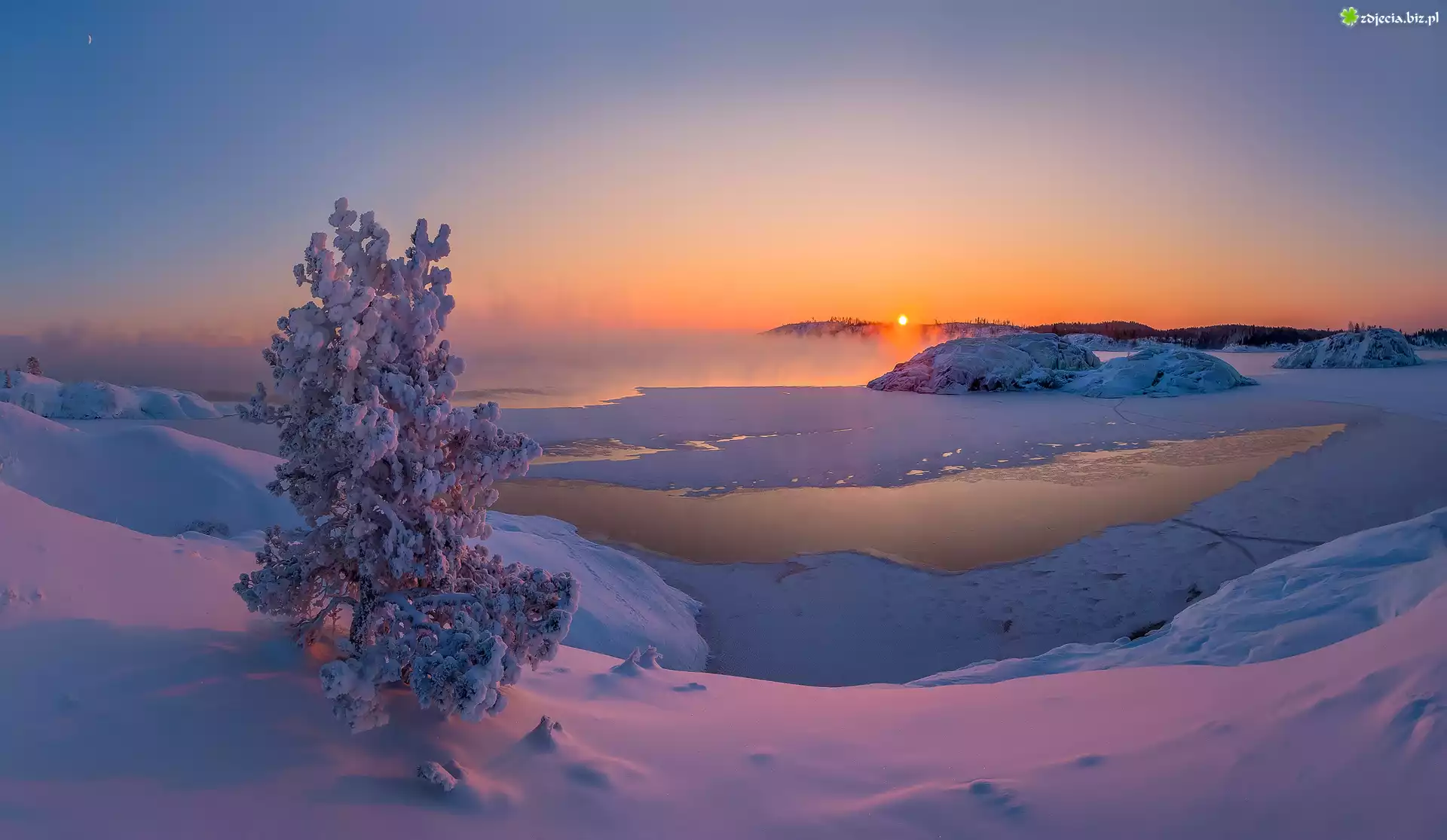 Zdjęcie Zima, Jezioro, Mgła, Ośnieżone, Drzewo, Zachód słońca