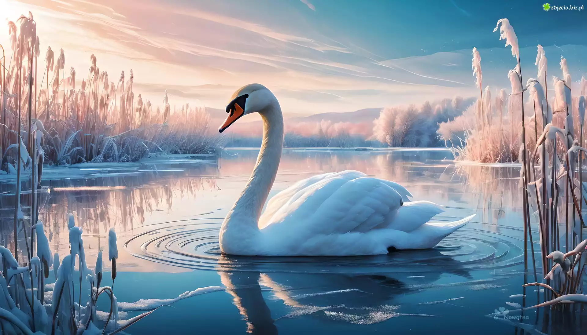 Zdjęcie Łabędź, Jezioro, Zmarznięte, Szuwary, Grafika
