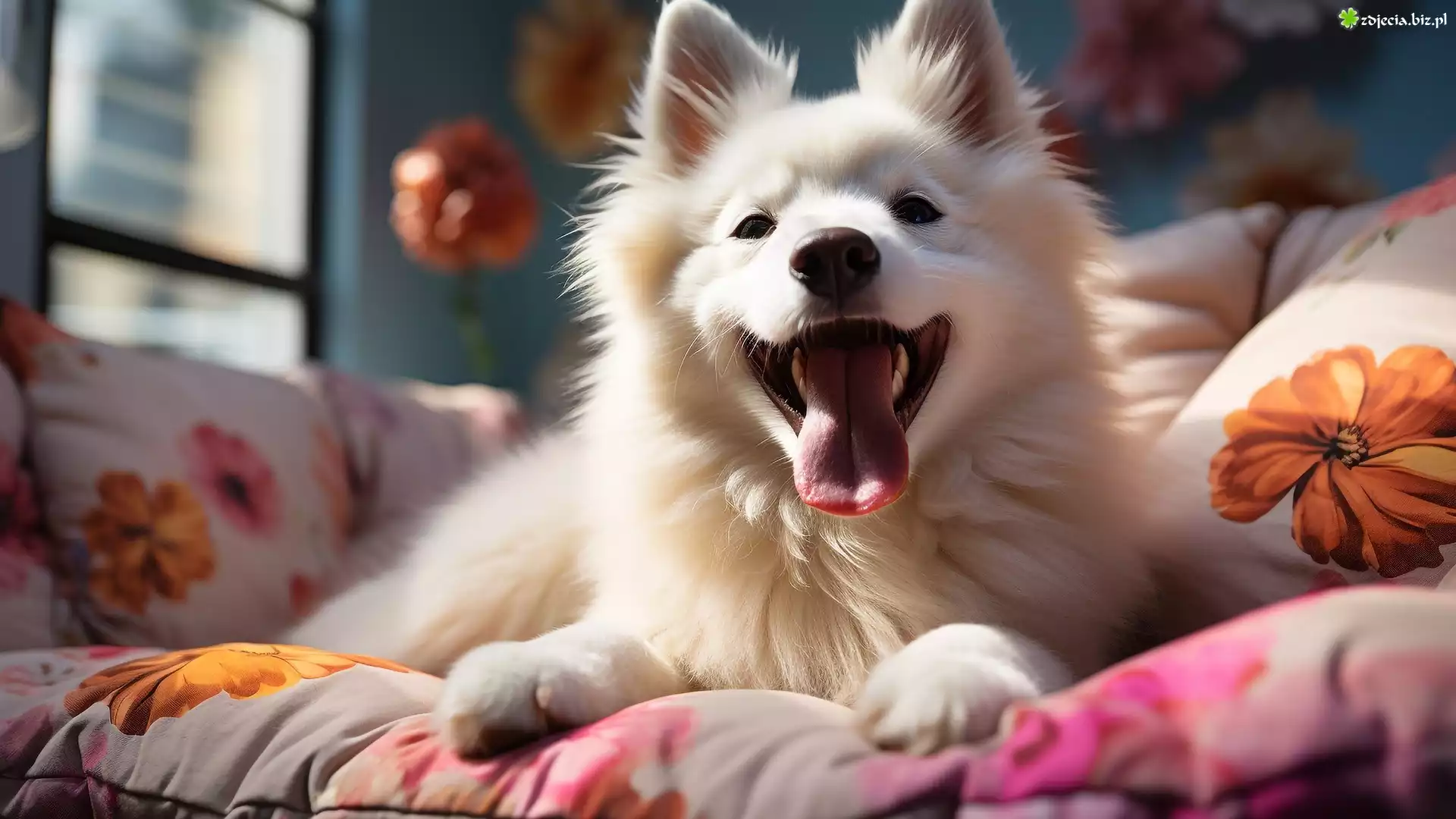 Zdjęcie Biały, Pies, Leżący, Język, Kołdra, Poduszki, AI