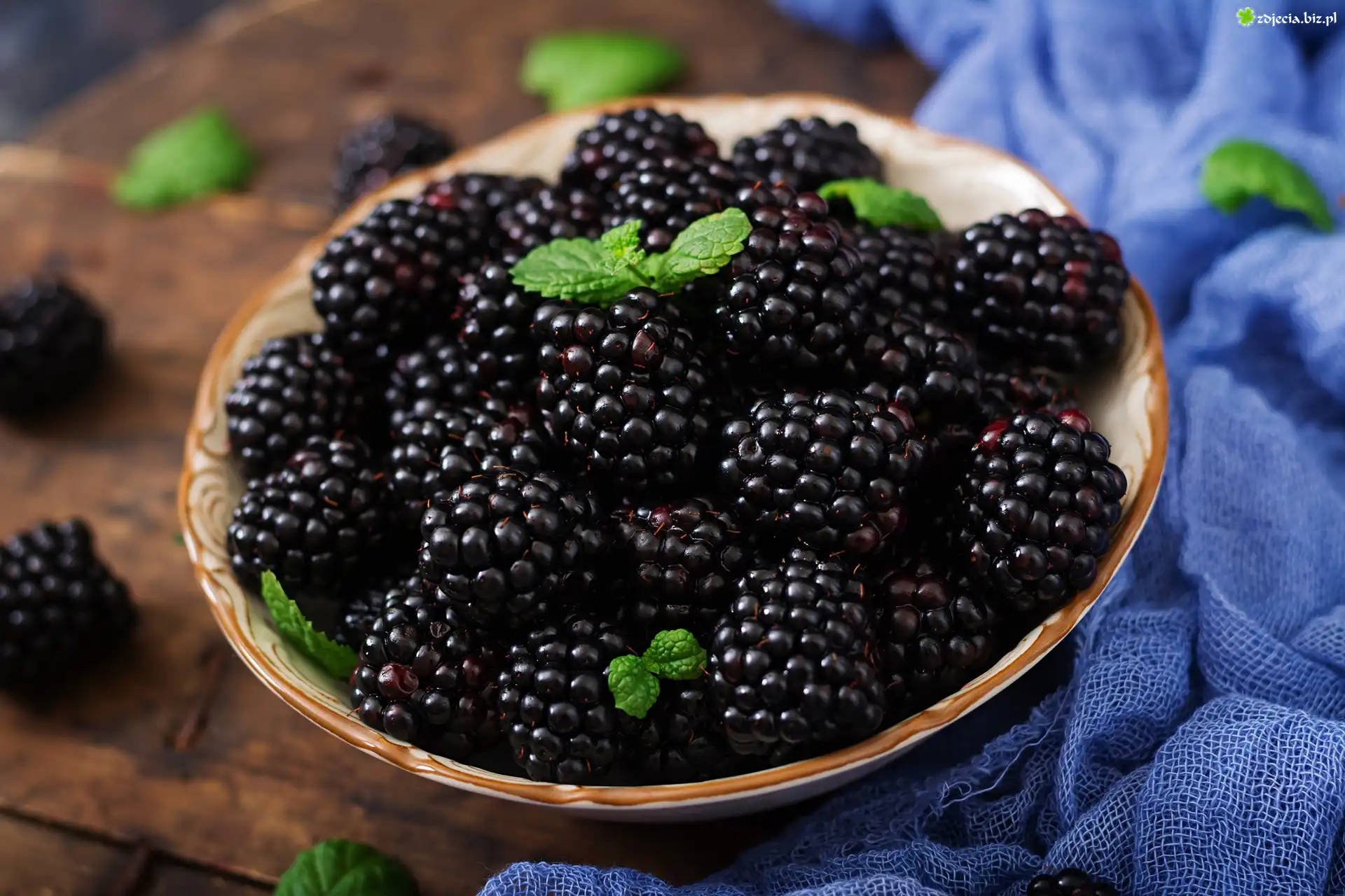 Zdjęcie Jeżyny, Mięta, Miska, Tkanina