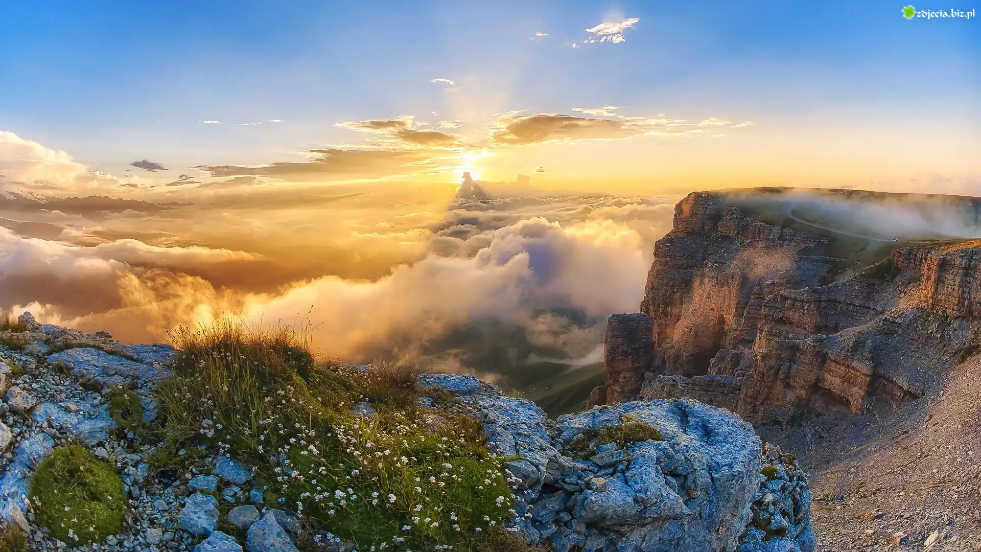 Zdjęcie Rosja, Kaukaz, Kabardo-Bałkaria, Góry, Skały, Kamienie, Mgła, Wschód słońca, Chmury